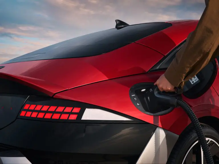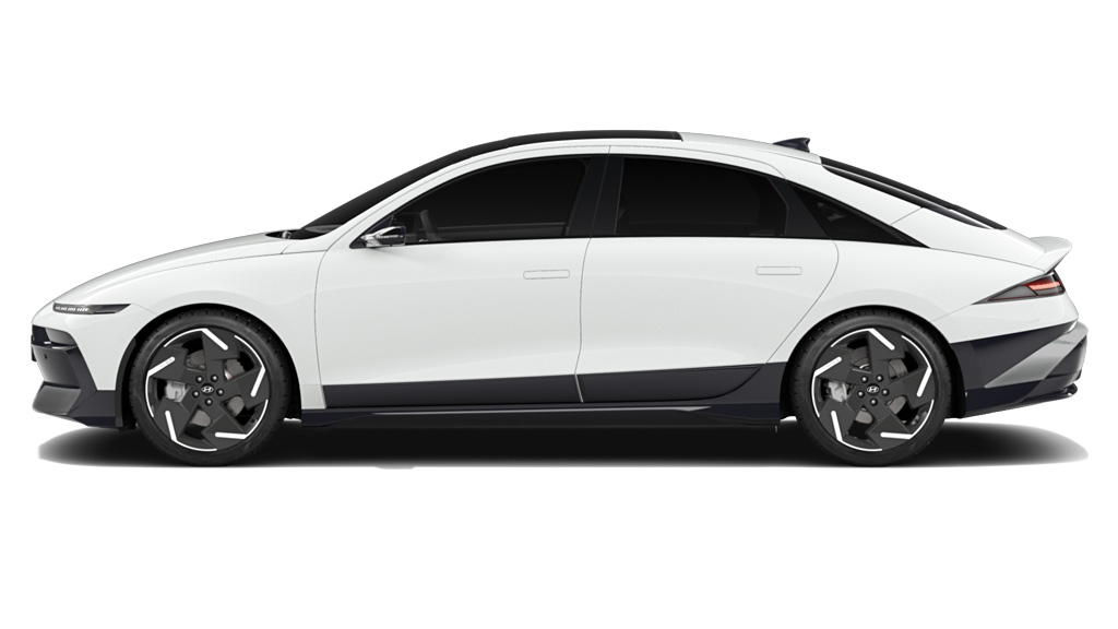 Jaunā IONIQ 6 paceltais pārsegs un izstieptā forma apvienojumā ar haizivs deguna dizainu veido slaidu profilu. Virsbūves apakšdaļas melnais dekors daļēji sedz arī durvis, izceļot IONIQ 6 plūdlīniju dizainu.